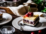 10. Testo premažemo z maslom. Češnje odcedimo in jih enakomerno razporedimo po testu. Polijemo z dvema žlicama masla in tremi žlicami preliva. Obložimo z novim listom testa. Malce potlačimo z dlanjo.