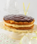 Testo enkrat prerežemo. Na spodnjo plast namažemo kremo in pokrijemo z drugo plastjo. Na sredino zlijemo čokoladni preliv in ga razmažemo tako, da ga nekaj steče po obodu torte.
