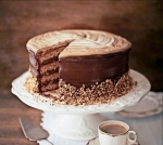 Pripravimo še kavno kremo za okraševanje. Tri žlice smetane, 1 žličko sladkorja v prahu in 1 žlico mleka damo v majhno skledo, preostalo smetano, sladkor, mleko in večino stopljene kave pa v večjo. Najprej stepemo belo smetano, nato kavno smetano, obe le toliko, da spominjata na peno na kapučinu, torej sta gosti, toda še vedno lahko stečeta z žlice. Večino kavne kreme razmažemo po vrhu torte. V kremo, ki nam je ostala, vtepemo še malo kave, da postane krema nekoliko temnejša.
