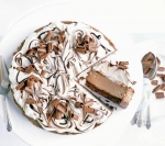 V model vlijemo čokoladno sirovo mešanico in vrh poravnamo. Pečemo 10 minut, nato pa temperaturo v pečici zmanjšamo na 110 °C in pečemo še 25 do 30 minut. Nadev bi moral v sredini biti še malo majav. Pečico ugasnemo, malo pripremo vrata in pustimo torto v pečici ohlajati 2 uri. Do postrežbe jo shranimo na hladno.