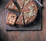 Kolač odstranimo iz pekača, ga premažemo z oblivom, posipamo s preostalimi oreški in postrežemo.