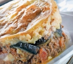 Pečico segrejemo na 180 °C (ali na 160 °C z ventilacijo). Po dnu velikega pekača razporedimo četrtino pečenih jajčevcev in jih prekrijemo s tretjino mesne mešanice. Po njej razmažemo približno štiri žlice bešamela. Postopek dvakrat ponovimo in končamo s plastjo jajčevcev. Prelijemo s preostalim bešamelom in posujemo s krušnimi drobtinami ter naribanim sirom kefalotiri.
