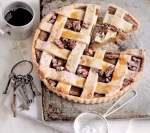 Pečemo še 15 do 20 minut ali toliko časa, da se testena mreža zlato rjavo zapeče, nadev pa naraste in je v sredini še malce mehak. Pustimo, da se popolnoma ohladi, nato obrežemo robove in pito poprašimo s sladkorjem v prahu. Pokapamo z javorovim sirupom in postrežemo s stepeno sladko smetano.
