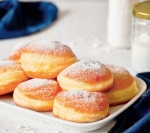 V še tople krofe nabrizgamo marelično marmelado, jih potresemo s sladkorjem v prahu in ponudimo.
