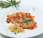 Zrezke ponudimo s pripravljeno omako in zelenjavo. Jed okrasimo z žajbljevimi lističi. Kot prilogo postrežemo instantno pšenico ali dušen riž.