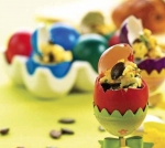 Kuhanim in pobarvanim jajcem odrežemo zgornjo tretjino. Z žličko previdno izdolbemo beljak in rumenjak. Tretjino izdolbenega narežemo na drobne koščke, ostalo lahko porabimo, na primer, za solato.