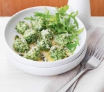 200 g listov mlade špinače 1 strt strok česna manjša pest peteršiljevih listov 150 g albuminske skute (rikote) 85 g moke 2 jajci 100 g sveže naribanega parmezana sveže nariban muškatni orešek parmezan, oljčno olje in rukola, ko postrežemo