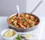 Takrat ji primešamo morske sadeže in ponev pokrijemo. Kuhljamo 5 minut oziroma tako dolgo, da se rakovi repki skuhajo in da se do konca skuha tudi riž. Paeljo pokapljamo z limonovim sokom, posujemo s peteršiljem in postrežemo s krhlji limone.