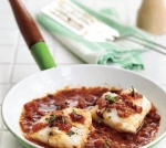 Ogenj zmanjšamo in omako kuhljamo 5 minut, nato ji dodamo še ribje fileje. Ponev pokrijemo in kuhljamo še 8 do 10 minut, da se riba do konca skuha. Postrežemo s pečenim ali v sopari kuhanim krompirjem.