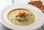 1 žlica olivnega olja 6 strokov česna 1 vejica svežega rožmarina 4 pločevink čičerike 3 l kokošje jušne osnove sol in sveže mleti poper sok polovice limone