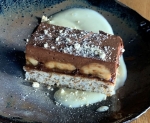 V kozico vlijemo mleko in ga segrejemo do vrenja. Kozico odstavimo in v vročem mleku raztopimo pripravljeno želatino. Premešamo, da se vsa želatina raztopi. Mleko z želatino prilijemo k stopljeni čokoladi in dobro premešamo, da dobimo gladko čokoladno zmes. Z lopatko nežno primešamo stepeno smetano. Pripravljen mousse prelijemo preko banan. Sladico pred rezanjem dobro ohladimo.