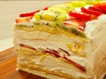 Kore narežemo na 3 enake dele. Pripravite sadje in začnite zlagati torto: skorja – krema – sadje – stepena smetana.