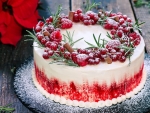 Ko se torta ohladi, nadaljujemo z okraševanjem. Torto lepo premažemo z masleno kremo, da so gladki robovi in ni videti sledov noža. Uporabimo rdečo barvo za živila, ki jo s čopičem nanesemo na spodnji del torte (glejte video). Ob stiku torte in podstavka nabrizgamo kroglice maslene kreme. Na vrhu v krogu damo sveže maline in ribez ter vejice rožmarina. Posujemo s sladkorjem v prahu, da dobimo videz snega.