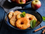 Jabolčne rezine eno za drugo pomočite v testo in jih ocvrite v vročem olju, približno 2-3 minute na vsaki strani, dokler ne postanejo zlato rjave.