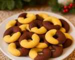 Najprej pripravite svetlo testo. Vse sestavine temeljito pregnetete, da dobite gladko, kompaktno maso. Najbolje se obnese ročno gnetenje. Enak postopek ponovite še s temnim testom. Ker je zaradi beljakov in kakava bolj lepljivo, mu po potrebi dodajte malo moke.