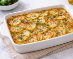 Pecite v pečici, ogreti na 180 °C, približno 45–50 minut, dokler krompir ni popolnoma mehak, vrh pa zlato zapečen.