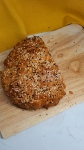 Testo položite v košaro cvrtnika na vroč zrak, obloženo s peki papirjem, premažite z jajcem in po želji potresite s sezamovimi semeni ali drugimi dodatki. Kruh pecite 40 minut pri 160 °C. Pečen je, ko potrkate po dnu hlebca in zaslišite votel zvok. Če se skorja prehitro zapeče, kruh lahko pokrijete z aluminijasto folijo.