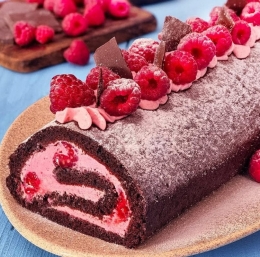 Vsaka rezina te rolade razkriva čudovito spiralo globoke temnega čokoladnega biskvita, pomešanega s svetlim malinovim nadevom, kar ponuja vizualno poslastico, ki je prav tako okusna, kot je videti.