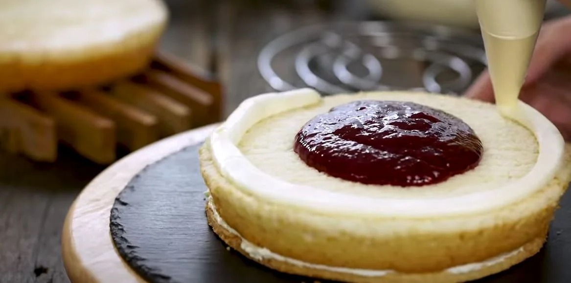 Na podstavek namažemo malo maslene kreme in nanj postavimo mandljev biskvit. Premažemo ga s tanko plastjo maslene kreme in na njo položimo bel tortni biskvit. Nanj prelijemo malinov nadev, ob robu pa damo plast maslene kreme, da se preliv ne razlije. Pokrijemo z drugim belim tortnim biskvitom in premažemo z masleno kremo. Postavimo v hladilnik za 30 minut.