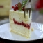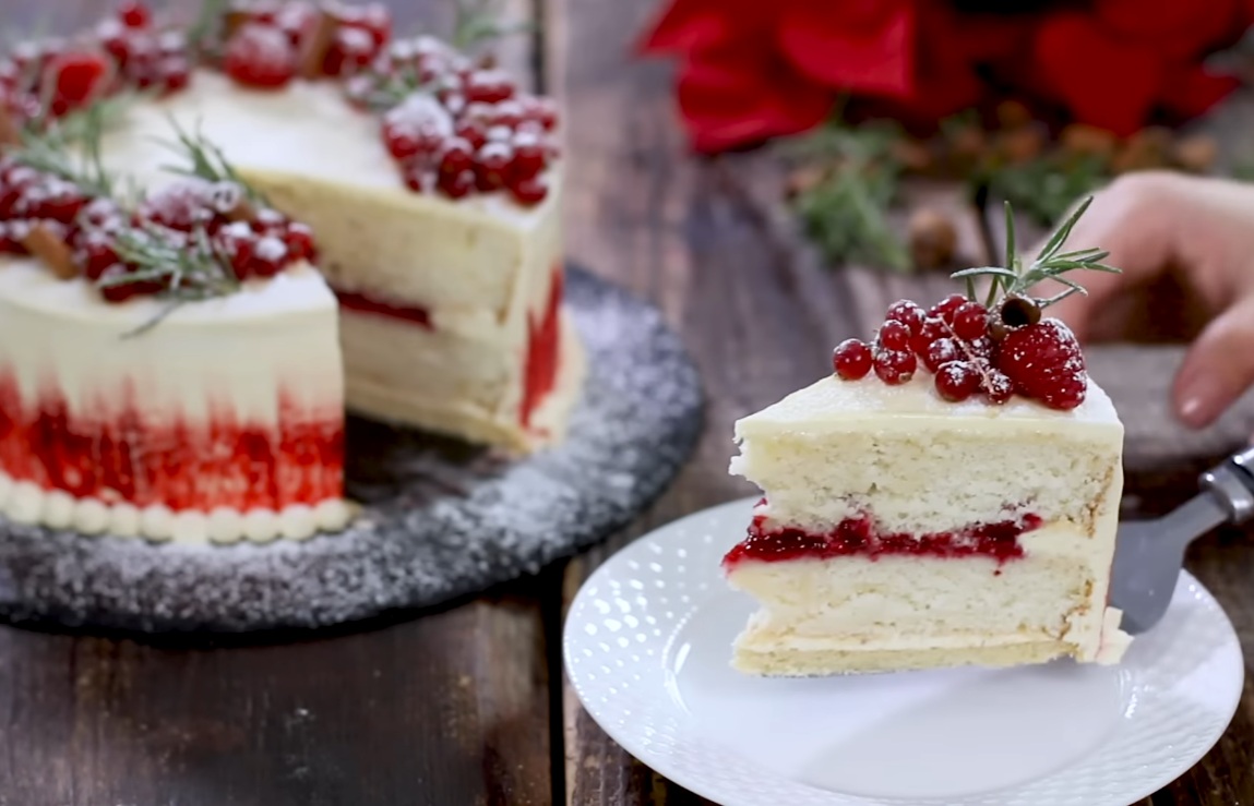 Ko se torta ohladi, nadaljujemo z okraševanjem. Torto lepo premažemo z masleno kremo, da so gladki robovi in ni videti sledov noža. Uporabimo rdečo barvo za živila, ki jo s čopičem nanesemo na spodnji del torte (glejte video). Ob stiku torte in podstavka nabrizgamo kroglice maslene kreme. Na vrhu v krogu damo sveže maline in ribez ter vejice rožmarina. Posujemo s sladkorjem v prahu, da dobimo videz snega.