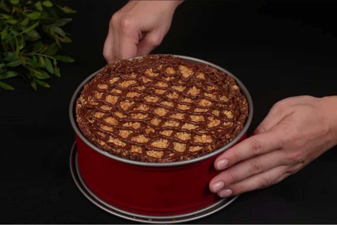 Piškote najprej grobo nalomite, nato pa jih v blenderju zmeljite v fine drobtine. Primešajte mlete orehe, dodajte stopljeno maslo in dobro premešajte. Pekač (19 cm) rahlo namastite z oljem in mešanico trdno vtisnite na dno. Po vrhu premažite tanko plast Nutelle.