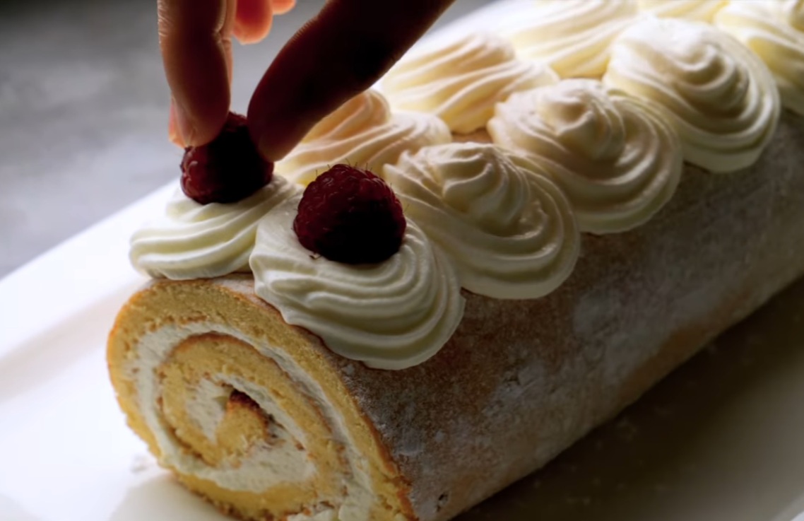 Vanilijeva rolada je znana po svoji nežni in zračni strukturi, ki jo dosežemo s pravilnim ločevanjem jajc in skrbnim vmešavanjem beljakov. Sveža smetana poskrbi za kremast, a ne pretežak nadev, maline pa dodajo popoln kontrast – rahlo kislost in svežino.