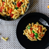 Polnozrnate testenine s špinačo, paradižnikom in feto
